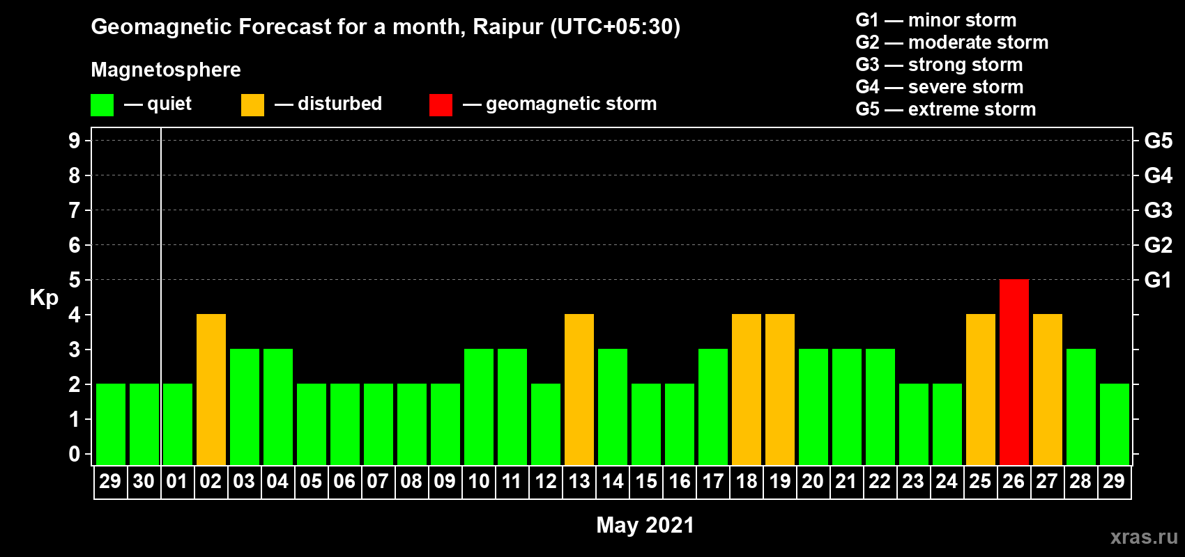 Geomagnetic storm forecast in Raipur for Apr 29, 2021