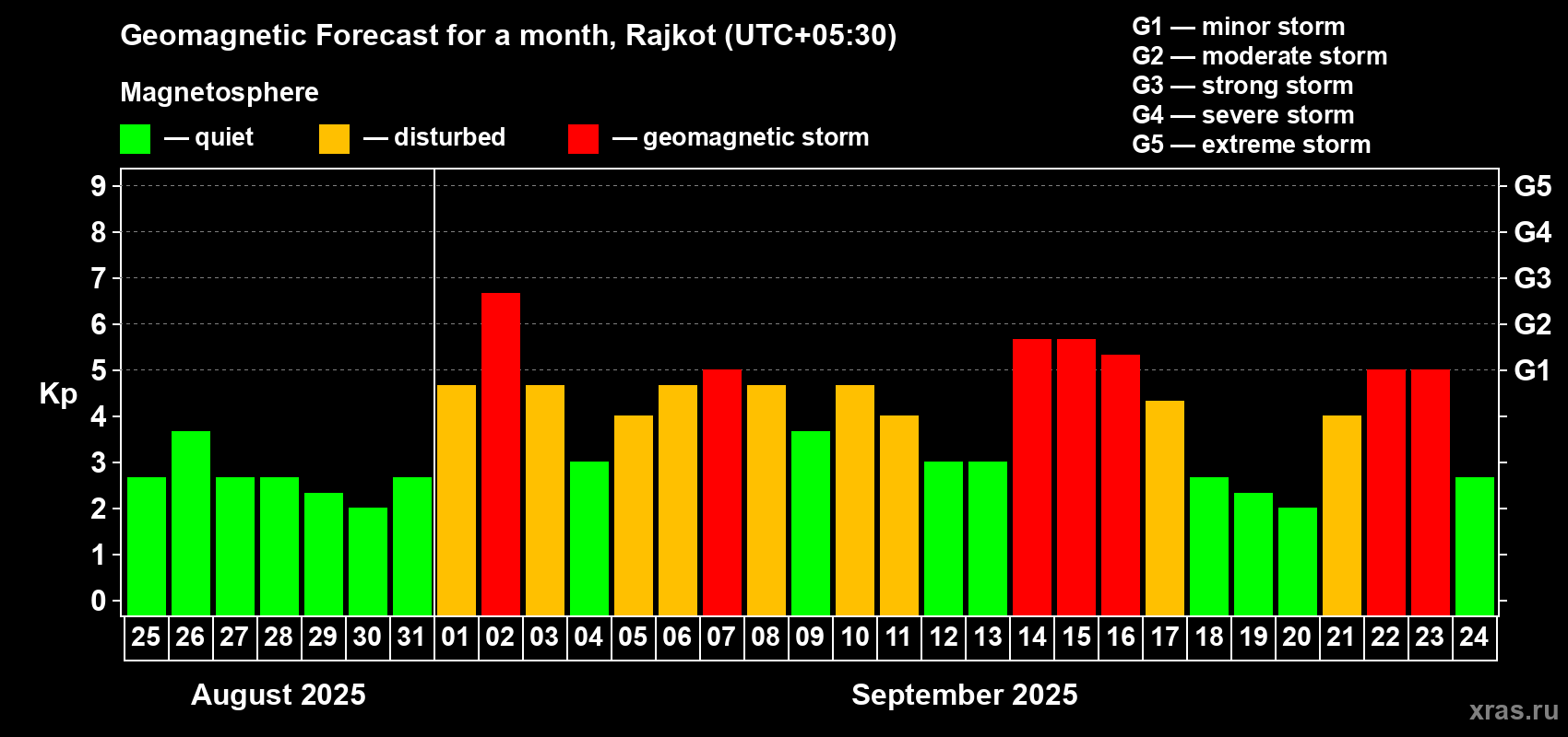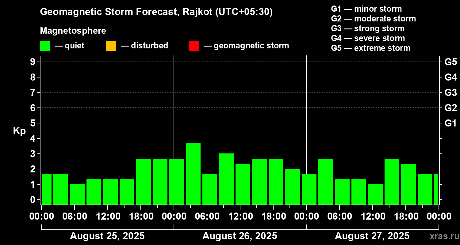 Geomagnetic storm forecast in Rajkot for Aug 25, 2025