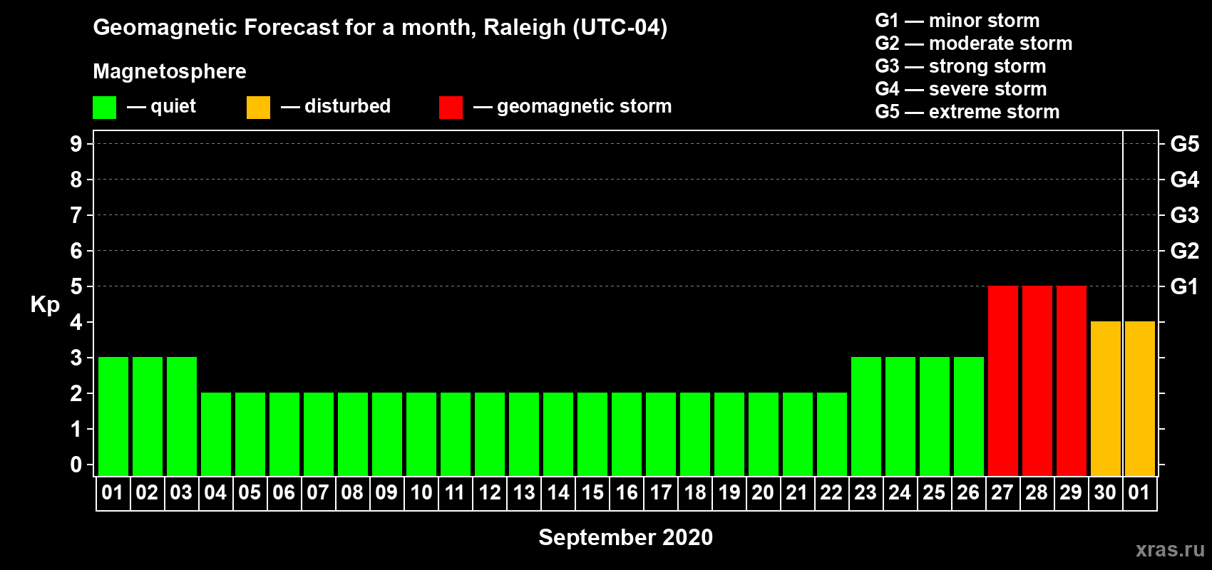 Geomagnetic storm forecast in Raleigh for Sep 01, 2020