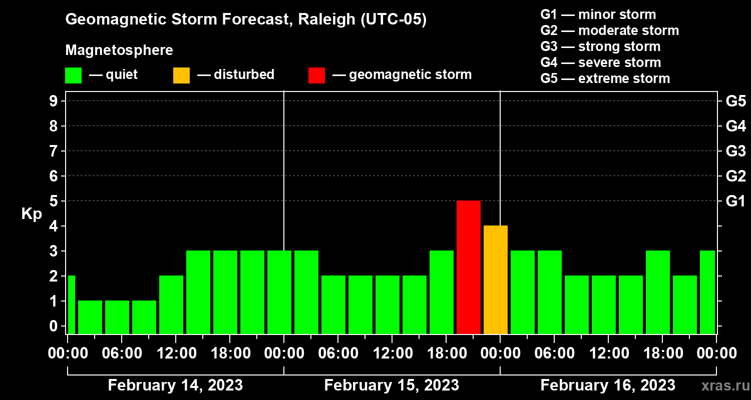 Geomagnetic storm forecast in Raleigh for Feb 14, 2023