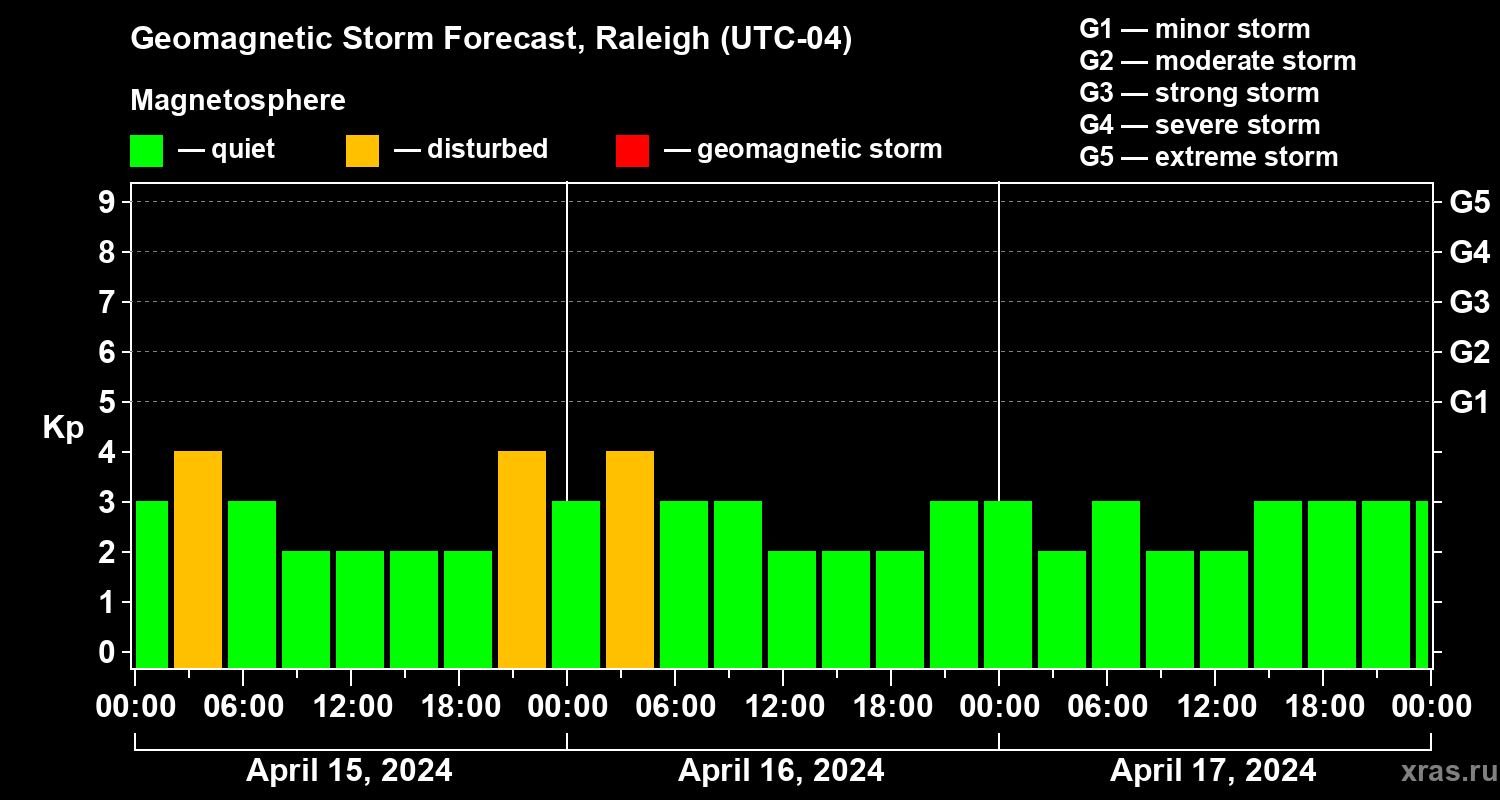 Geomagnetic storm forecast in Raleigh for Apr 15, 2024