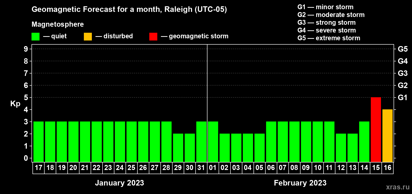 Geomagnetic storm forecast in Raleigh for Jan 17, 2023