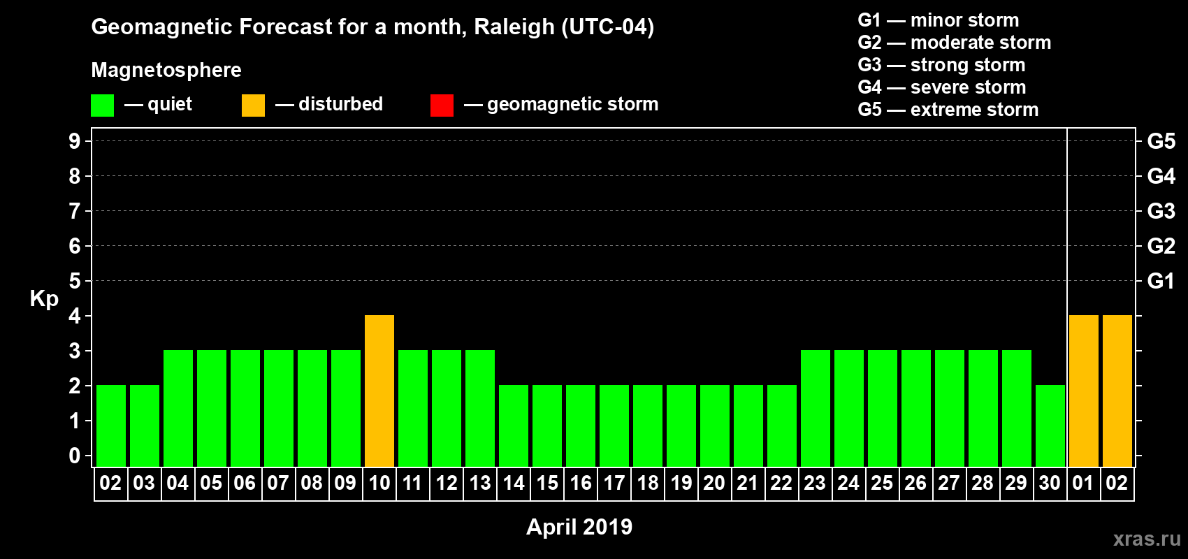 Geomagnetic storm forecast in Raleigh for Apr 02, 2019