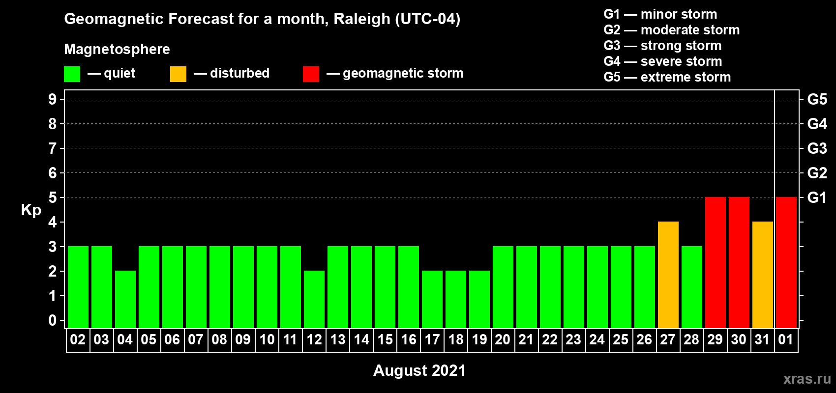 Geomagnetic storm forecast in Raleigh for Aug 02, 2021