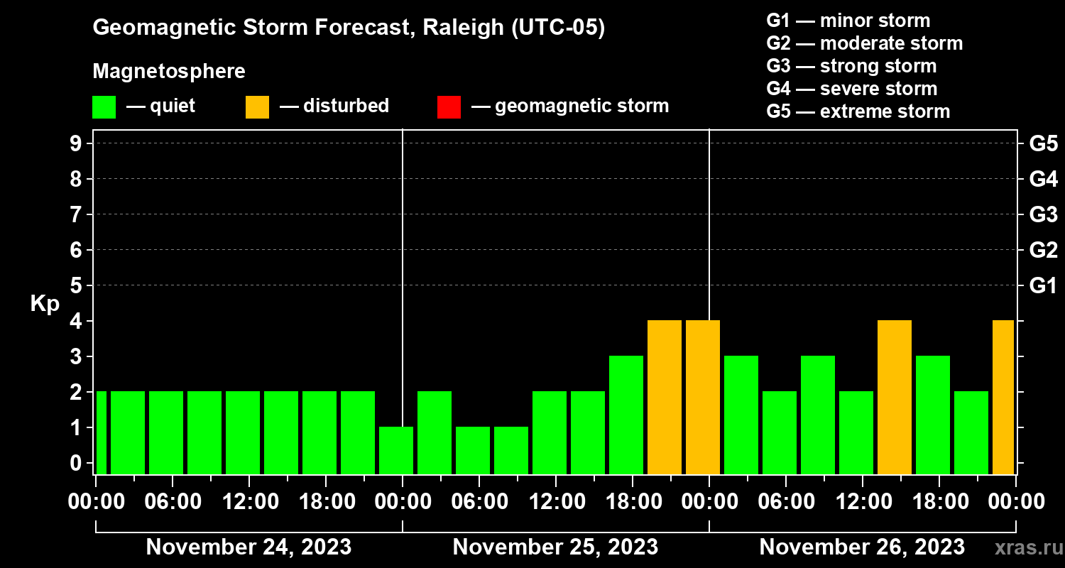 Geomagnetic storm forecast in Raleigh for Nov 24, 2023