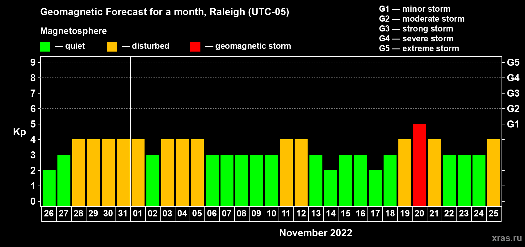 Geomagnetic storm forecast in Raleigh for Oct 26, 2022