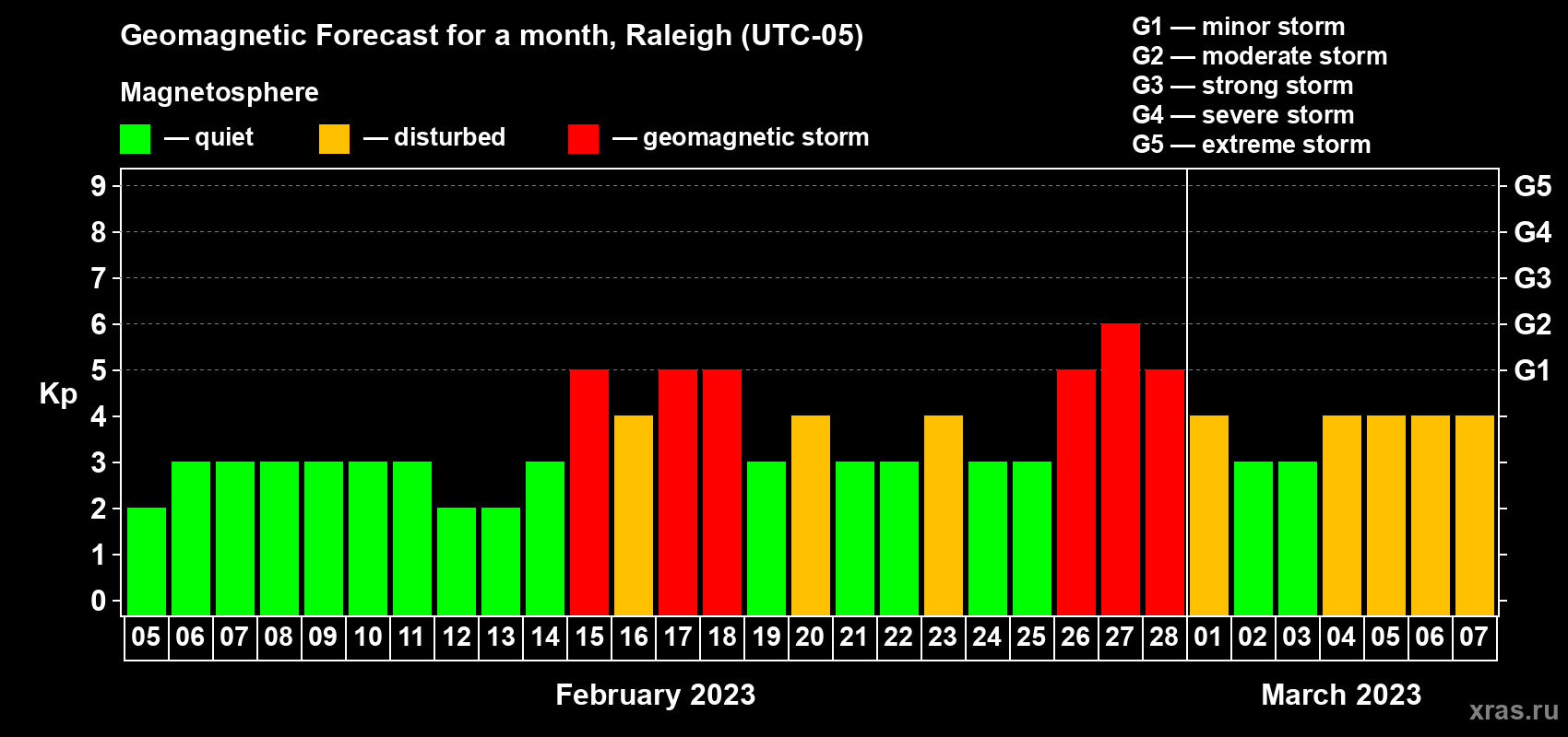 Geomagnetic storm forecast in Raleigh for Feb 05, 2023