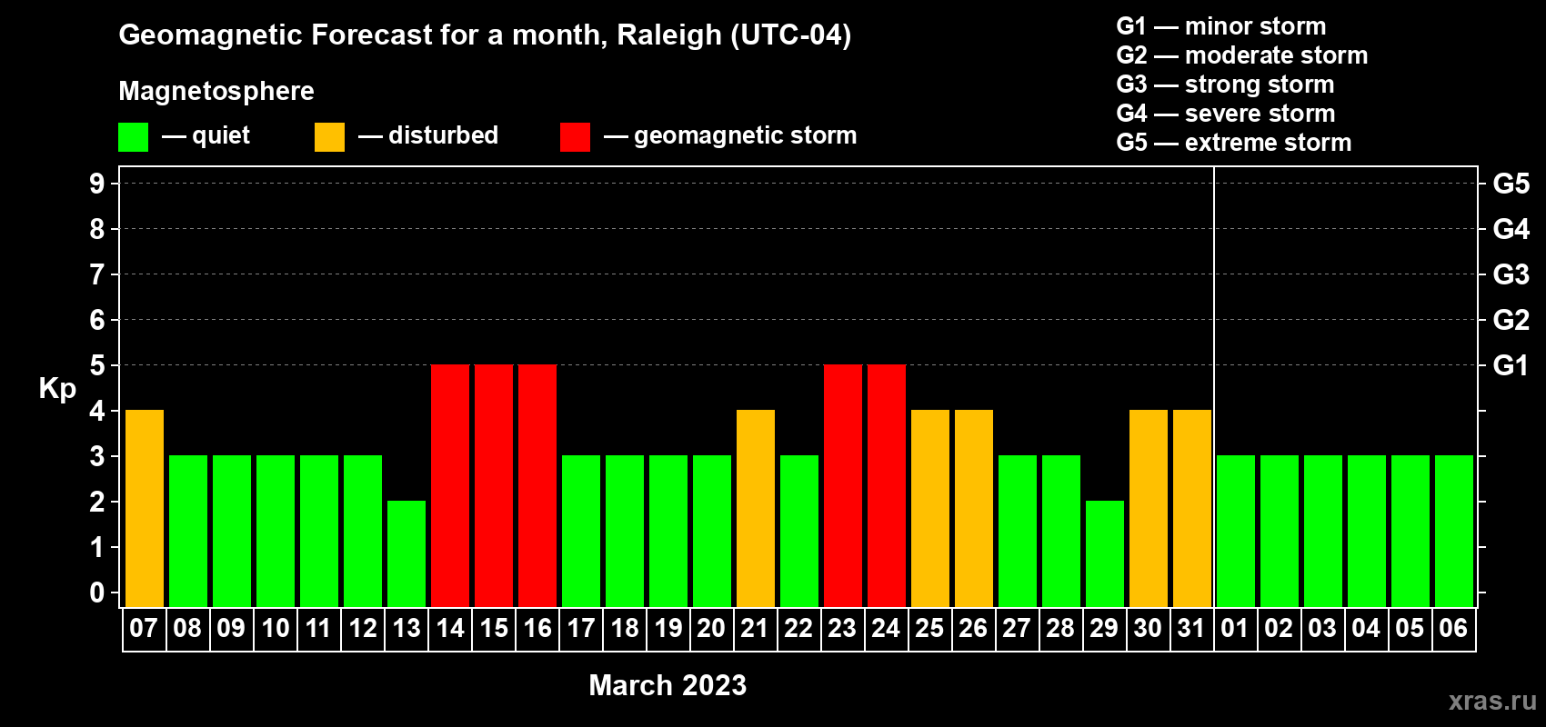 Geomagnetic storm forecast in Raleigh for Mar 07, 2023