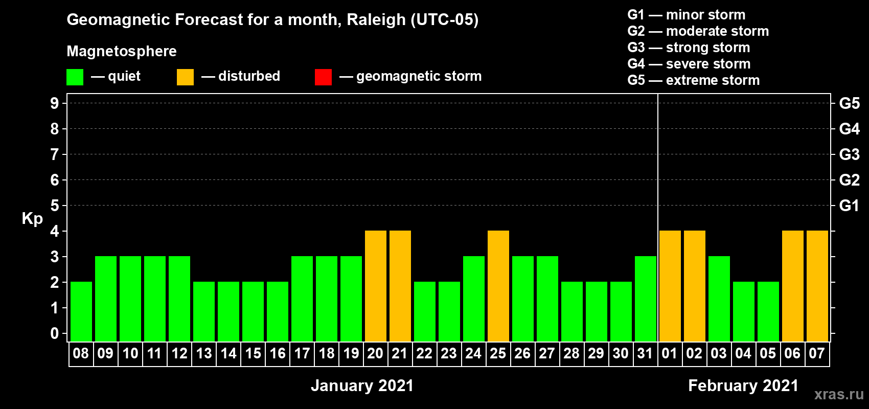Geomagnetic storm forecast in Raleigh for Jan 08, 2021