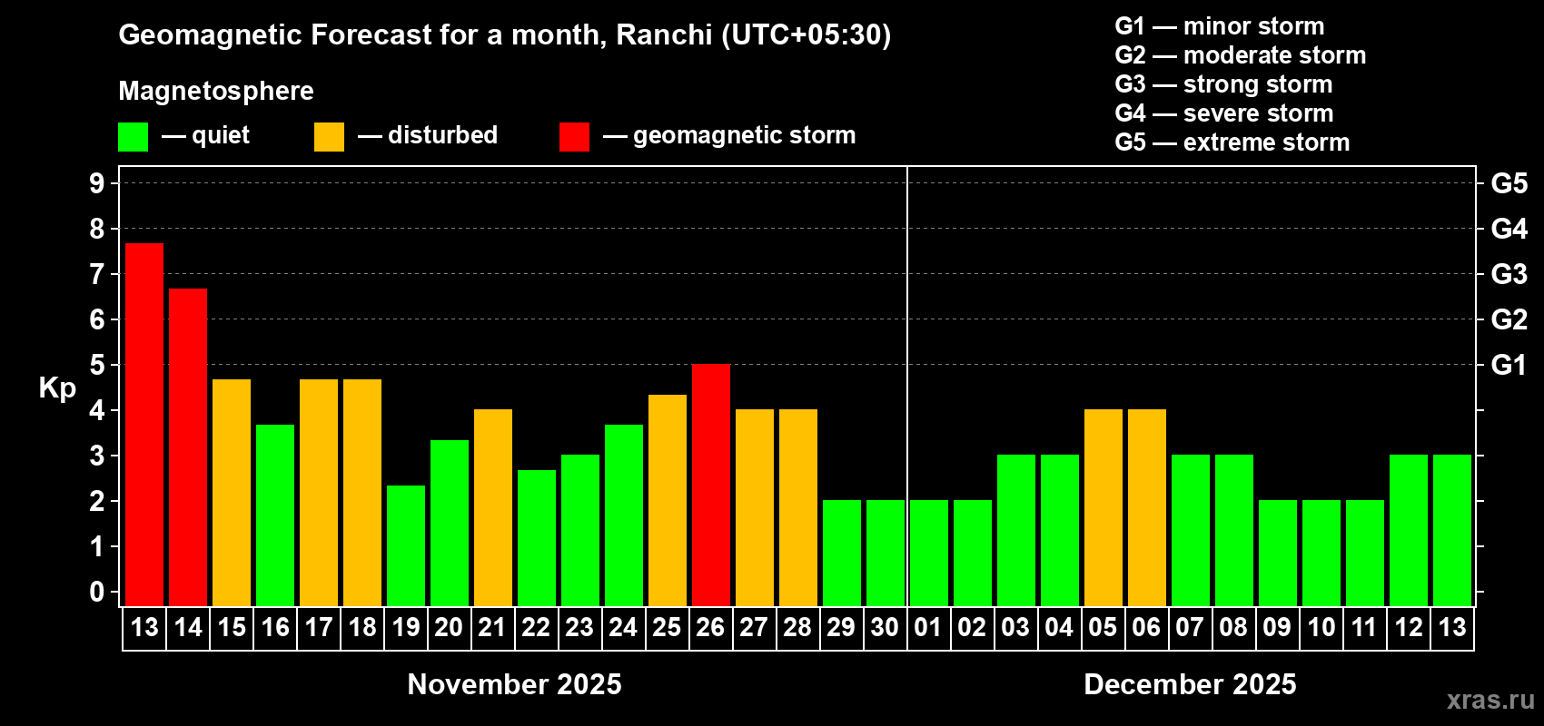 Geomagnetic storm forecast in Ranchi for Nov 13, 2025