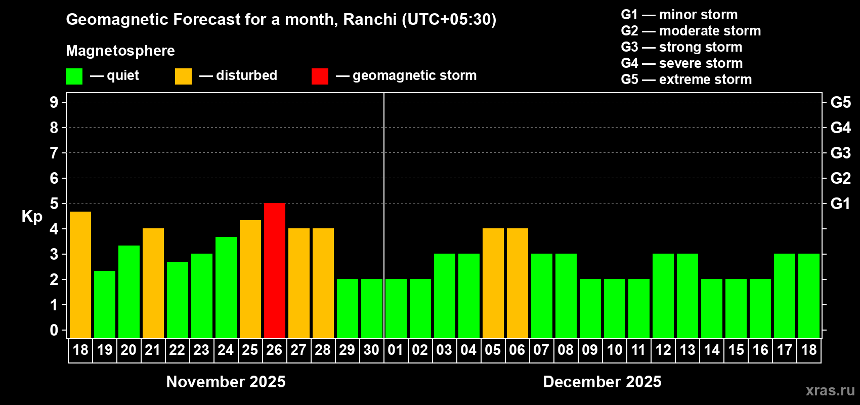 Geomagnetic storm forecast in Ranchi for Nov 18, 2025