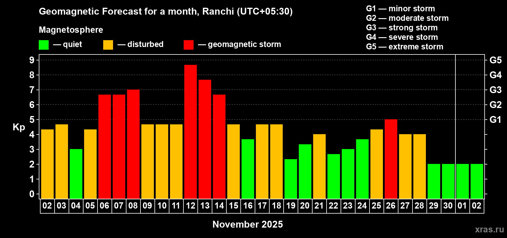 Geomagnetic storm forecast in Ranchi for Nov 02, 2025