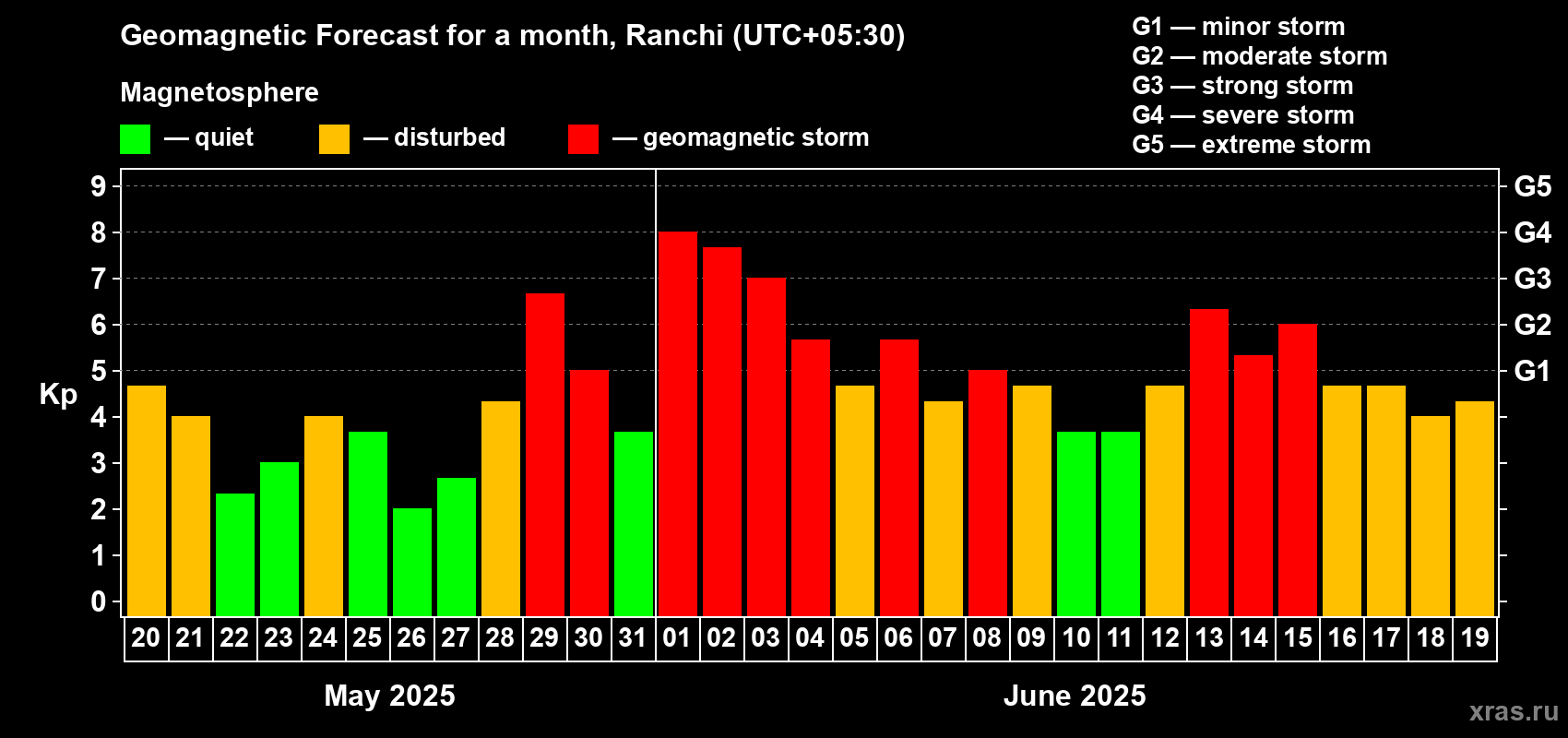 Geomagnetic storm forecast in Ranchi for May 20, 2025