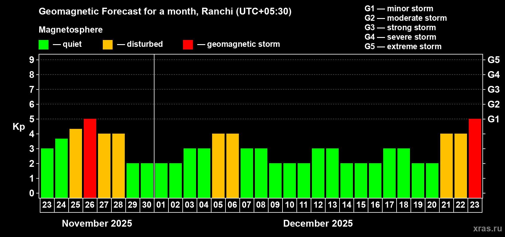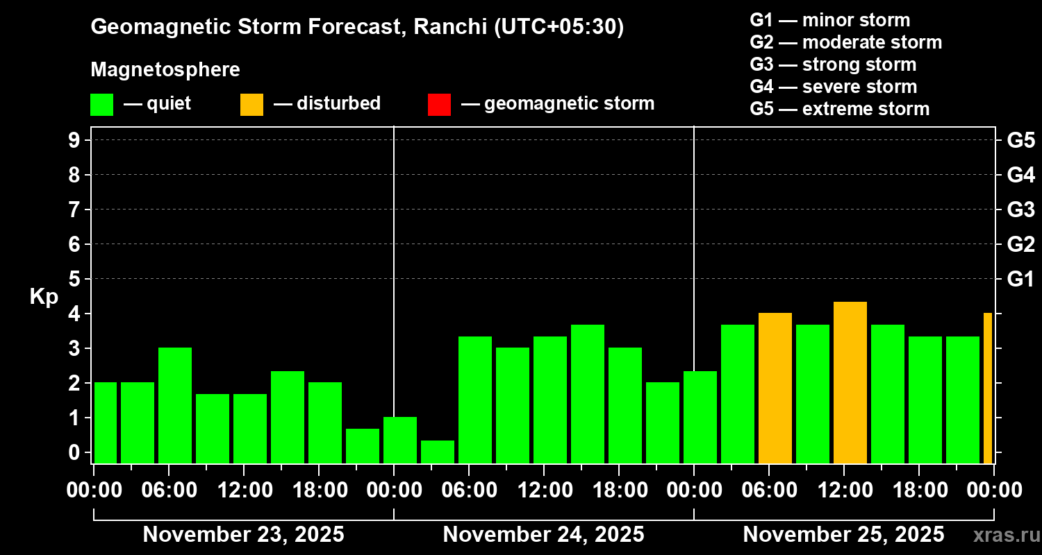 Geomagnetic storm forecast in Ranchi for Nov 23, 2025