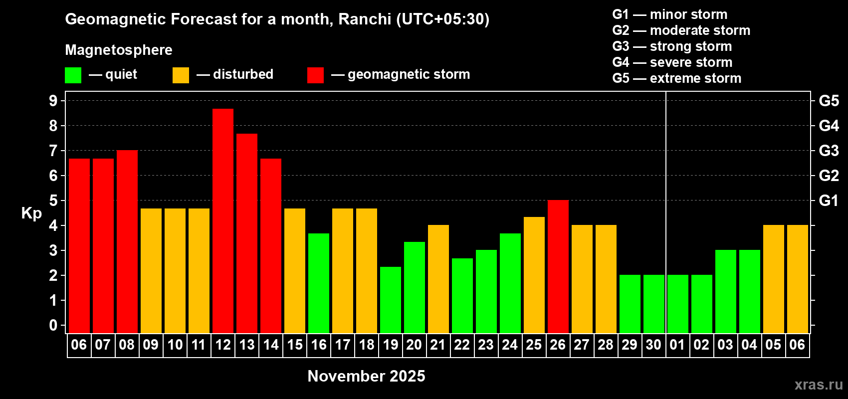 Geomagnetic storm forecast in Ranchi for Nov 06, 2025