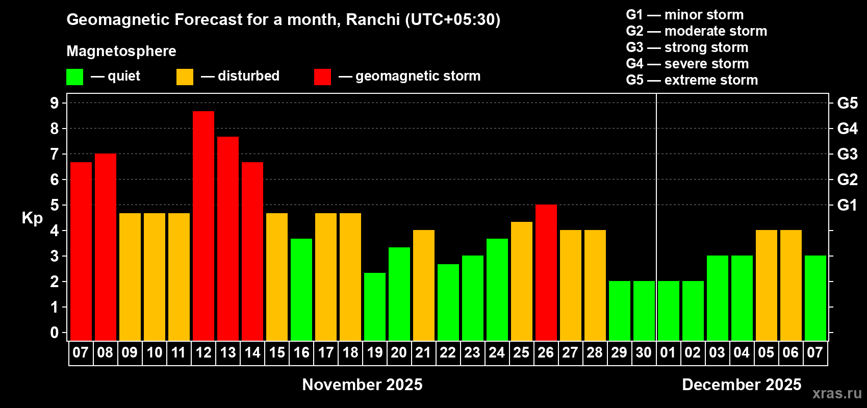 Geomagnetic storm forecast in Ranchi for Nov 07, 2025