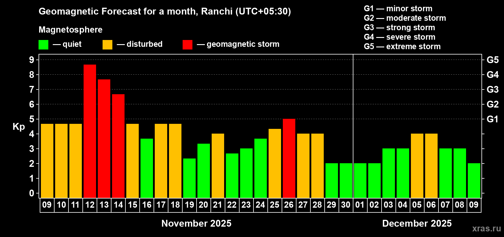 Geomagnetic storm forecast in Ranchi for Nov 09, 2025