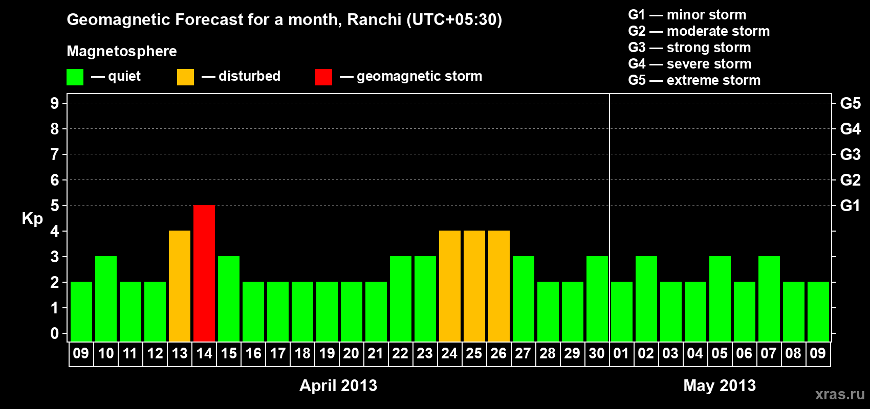 Geomagnetic storm forecast in Ranchi for Apr 09, 2013