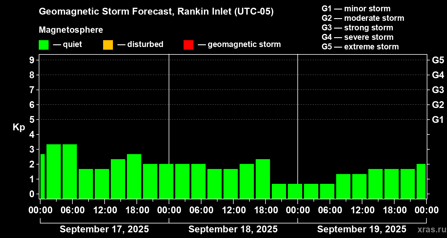 Geomagnetic storm forecast in Rankin Inlet for Sep 17, 2025
