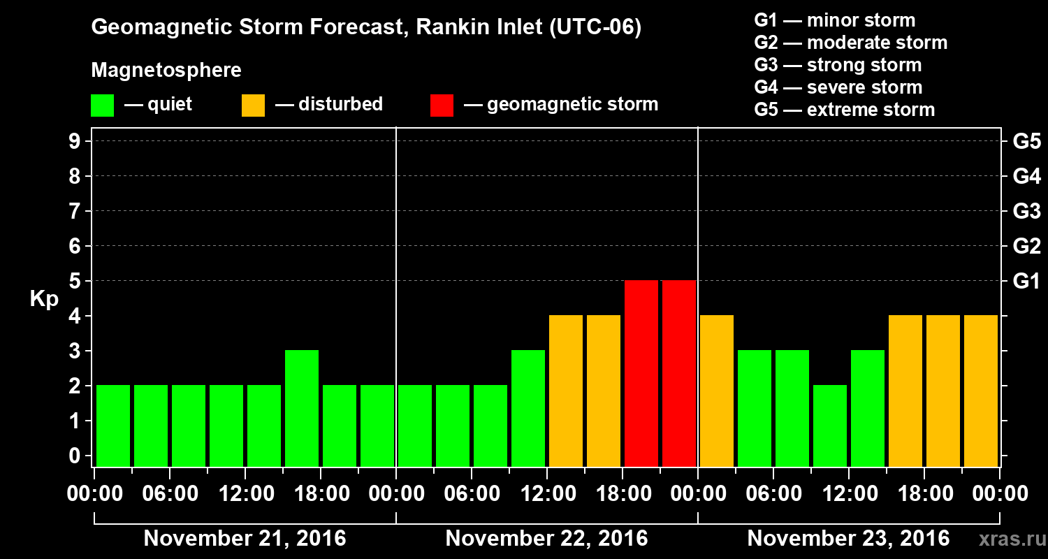Geomagnetic storm forecast in Rankin Inlet for Nov 21, 2016
