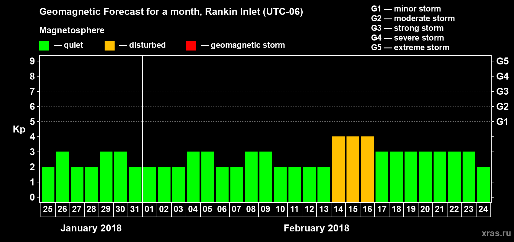 Geomagnetic storm forecast in Rankin Inlet for Jan 25, 2018