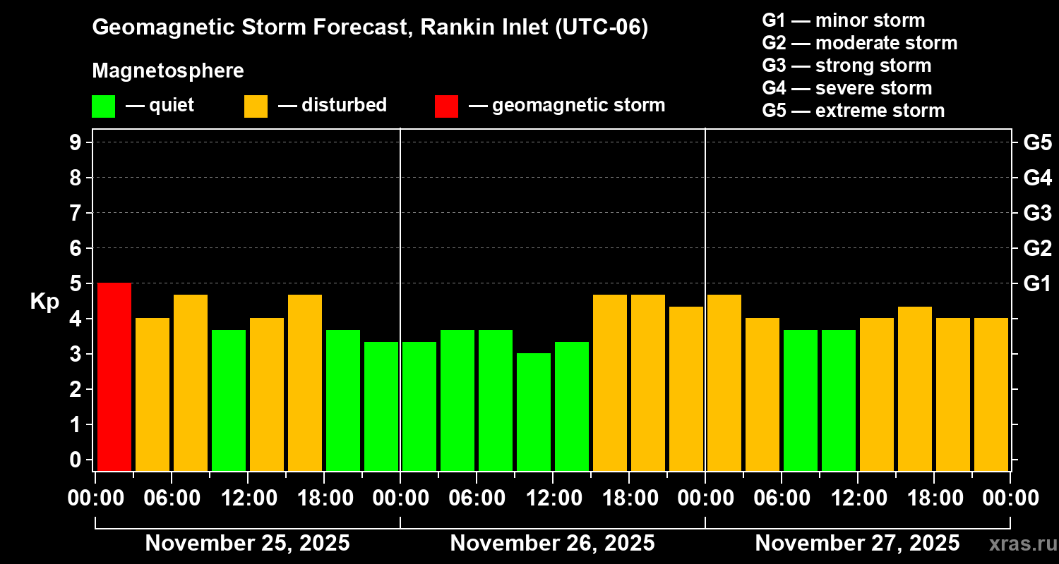 Geomagnetic storm forecast in Rankin Inlet for Nov 25, 2025