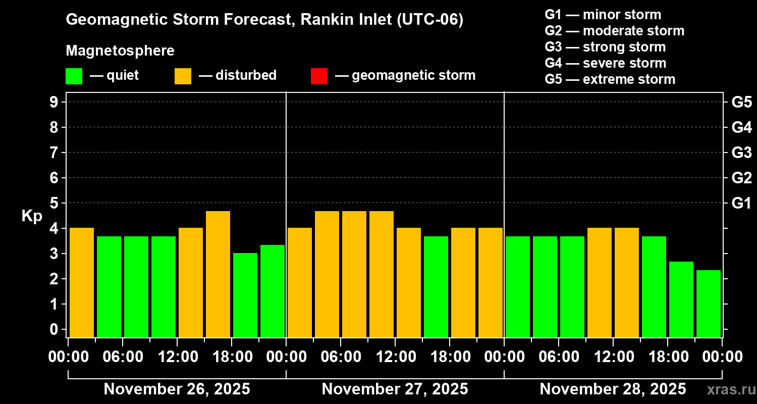 Geomagnetic storm forecast in Rankin Inlet for Nov 26, 2025