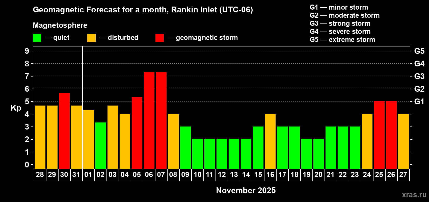 Geomagnetic storm forecast in Rankin Inlet for Oct 28, 2025