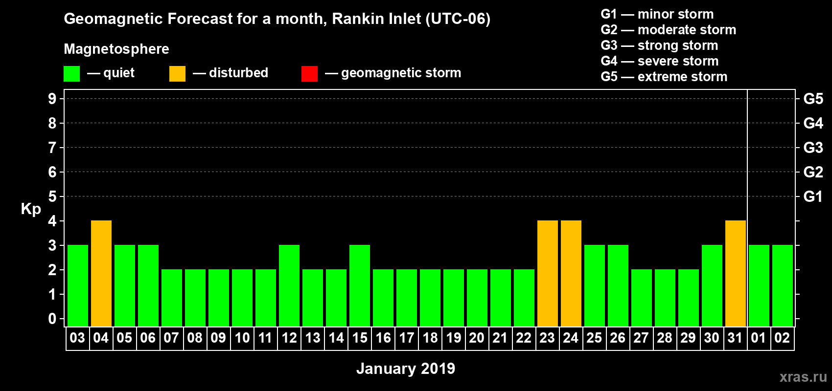Geomagnetic storm forecast in Rankin Inlet for Jan 03, 2019