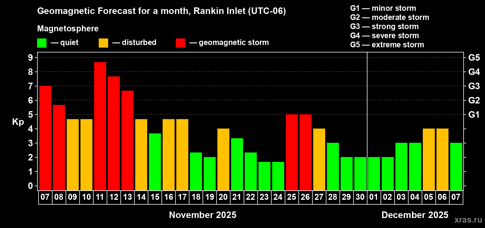 Geomagnetic storm forecast in Rankin Inlet for Nov 07, 2025
