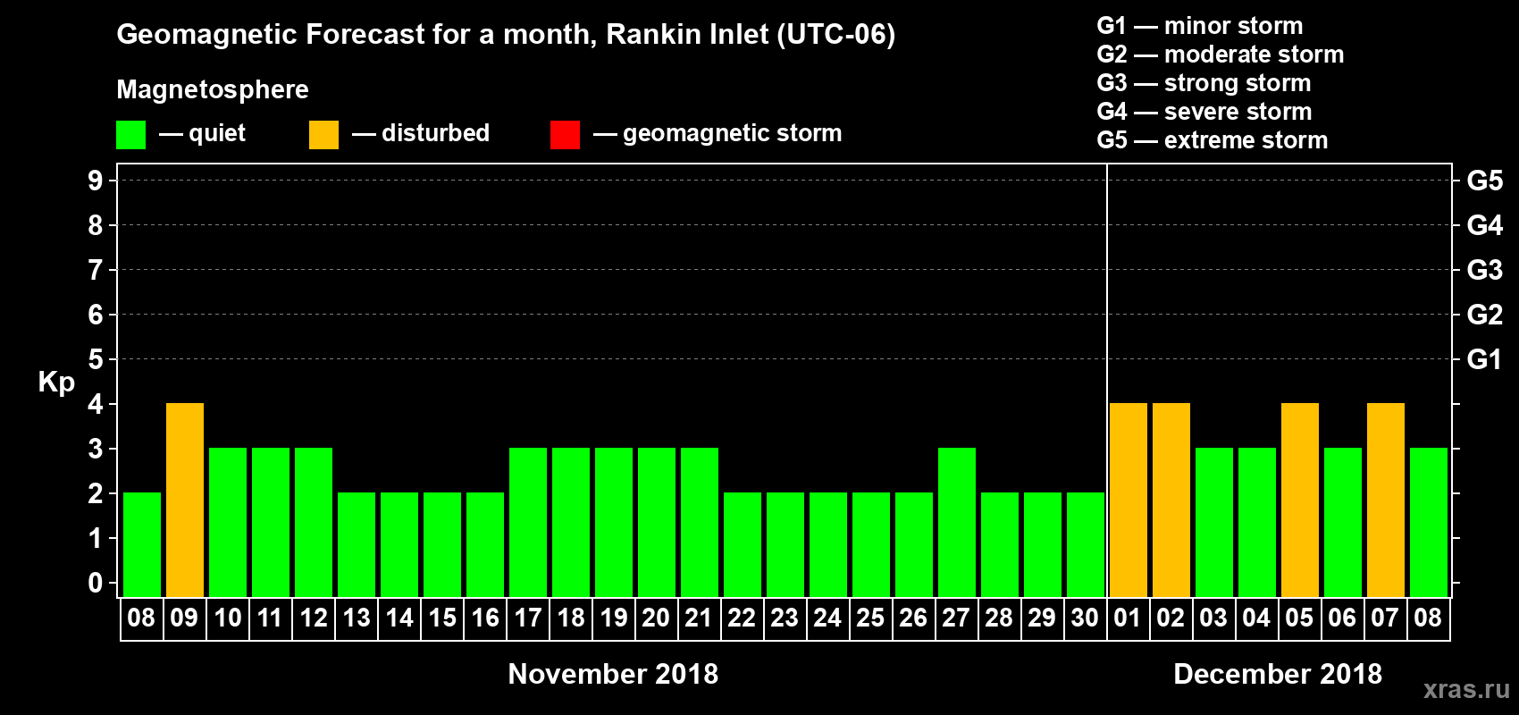 Geomagnetic storm forecast in Rankin Inlet for Nov 08, 2018