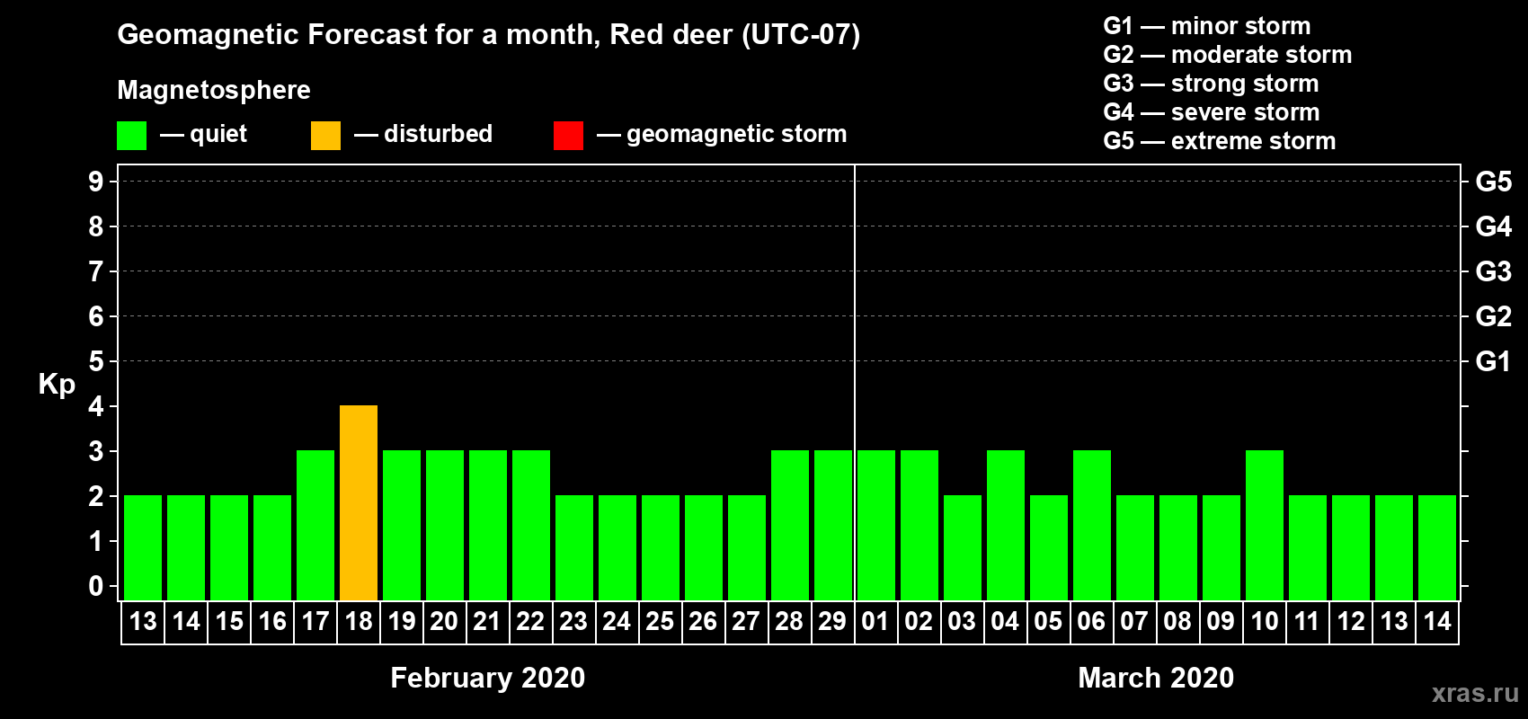 Geomagnetic storm forecast in Red deer for Feb 13, 2020