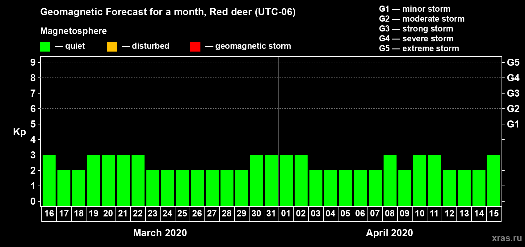 Geomagnetic storm forecast in Red deer for Mar 16, 2020