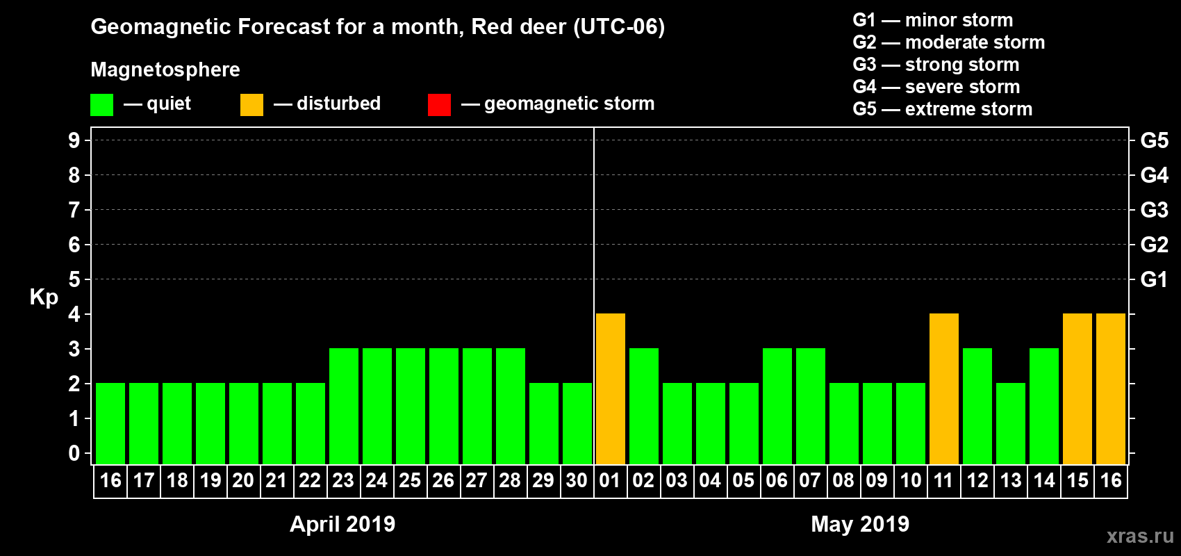 Geomagnetic storm forecast in Red deer for Apr 16, 2019