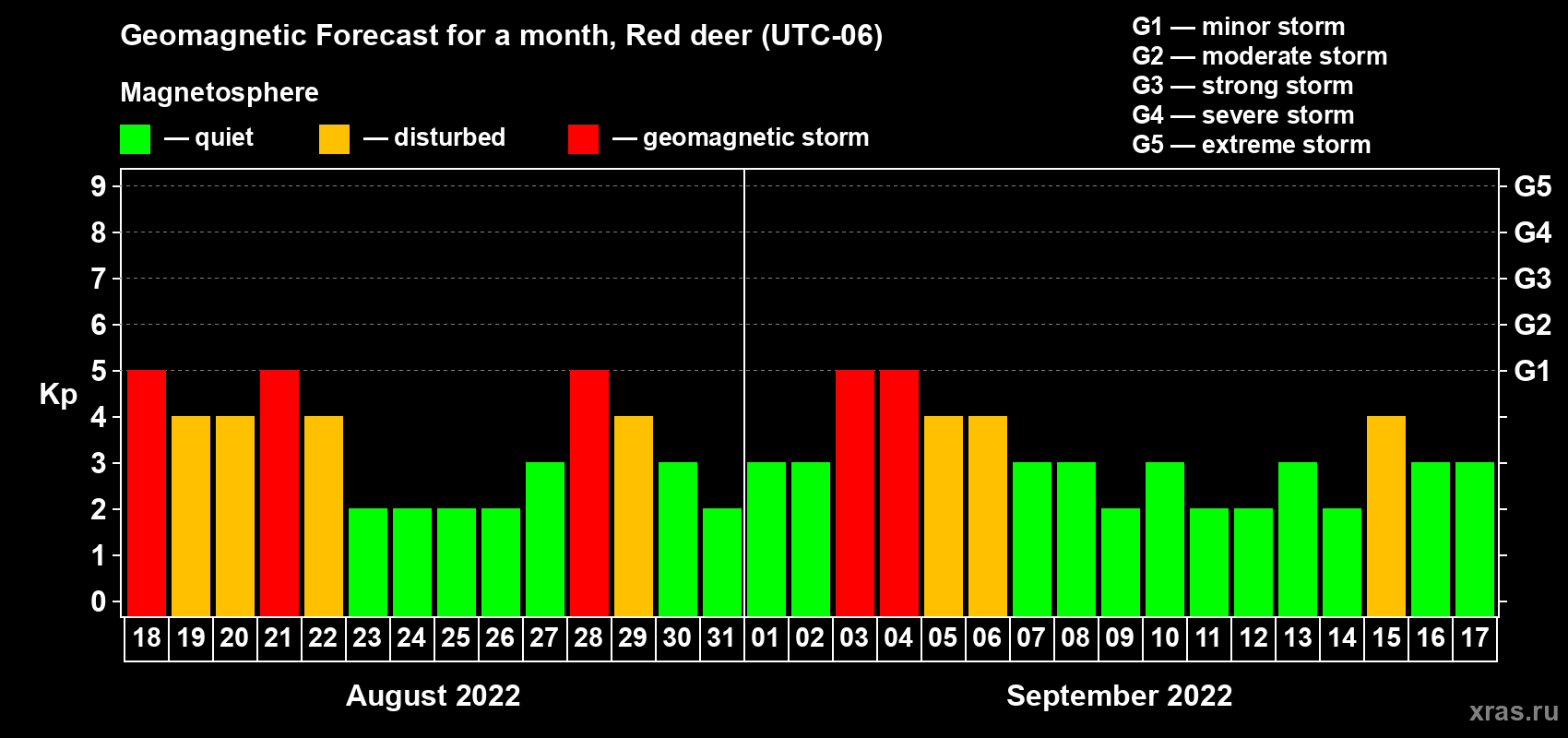 Geomagnetic storm forecast in Red deer for Aug 18, 2022