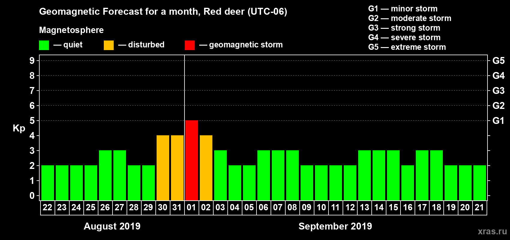 Geomagnetic storm forecast in Red deer for Aug 22, 2019