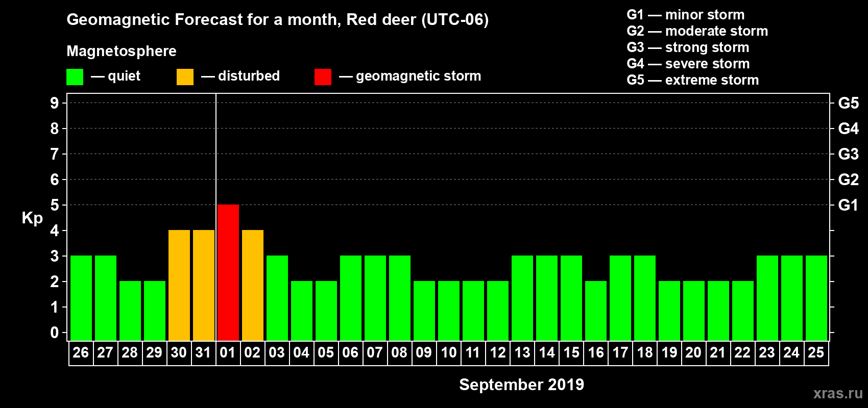 Geomagnetic storm forecast in Red deer for Aug 26, 2019