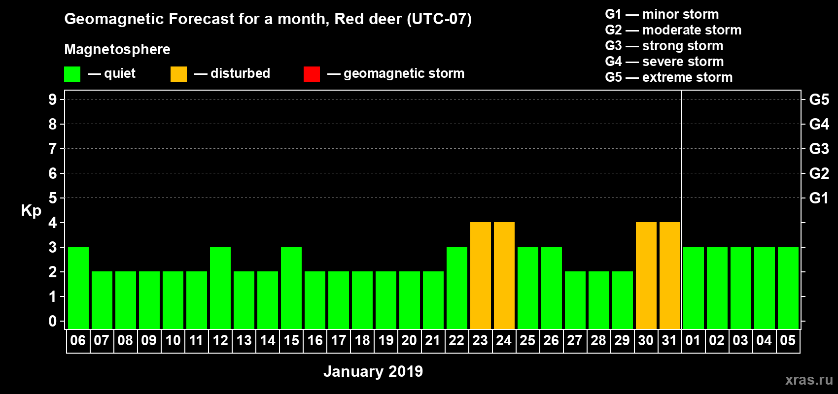 Geomagnetic storm forecast in Red deer for Jan 06, 2019