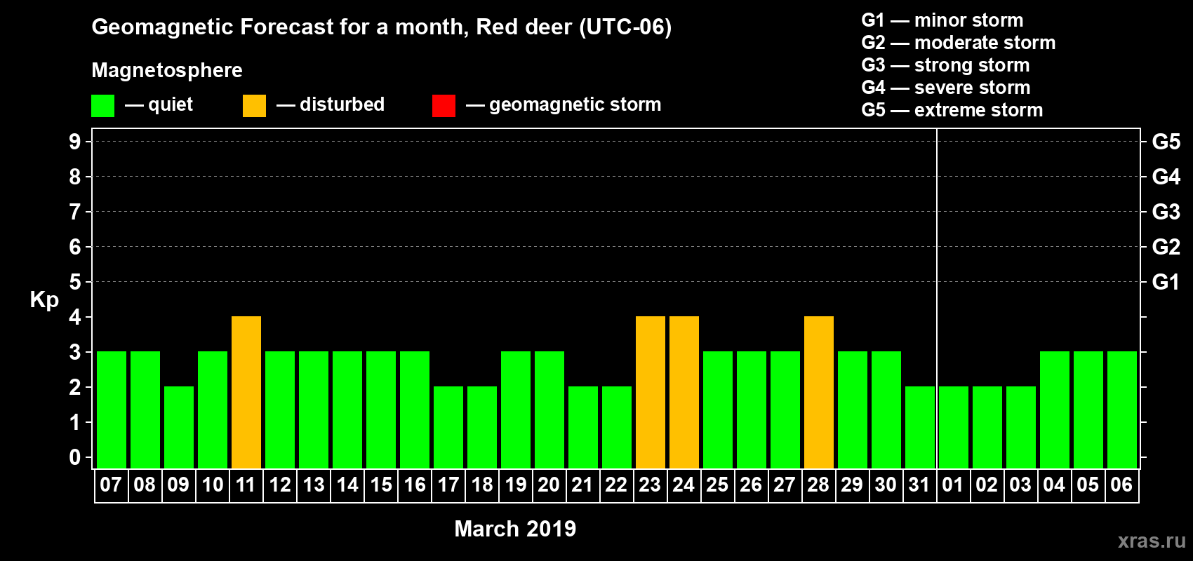 Geomagnetic storm forecast in Red deer for Mar 07, 2019