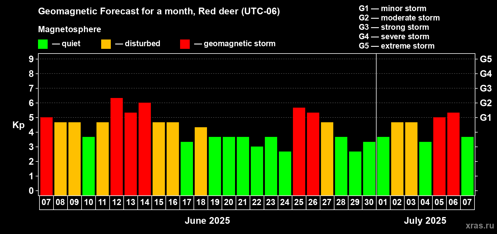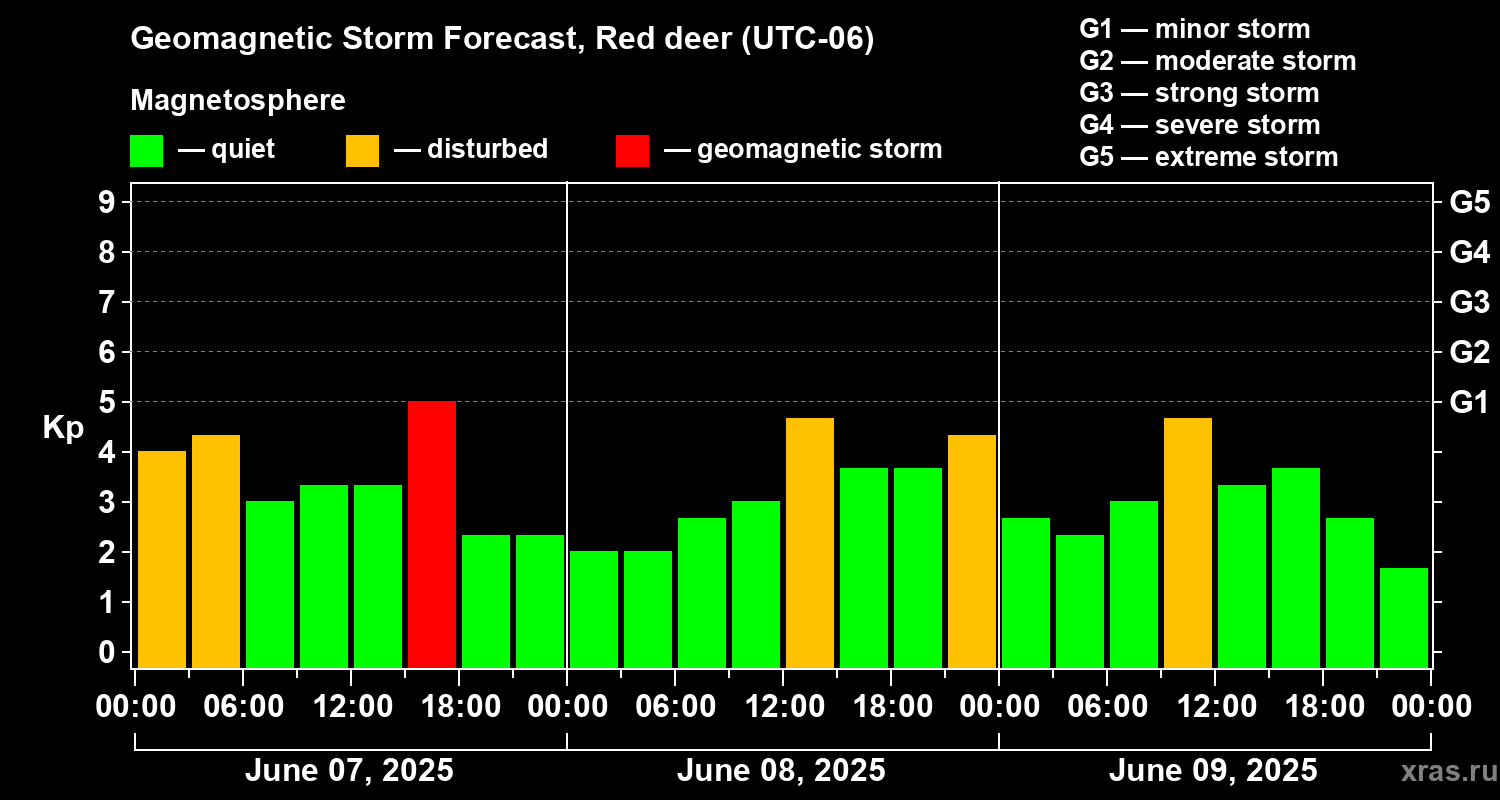Geomagnetic storm forecast in Red deer for Jun 07, 2025