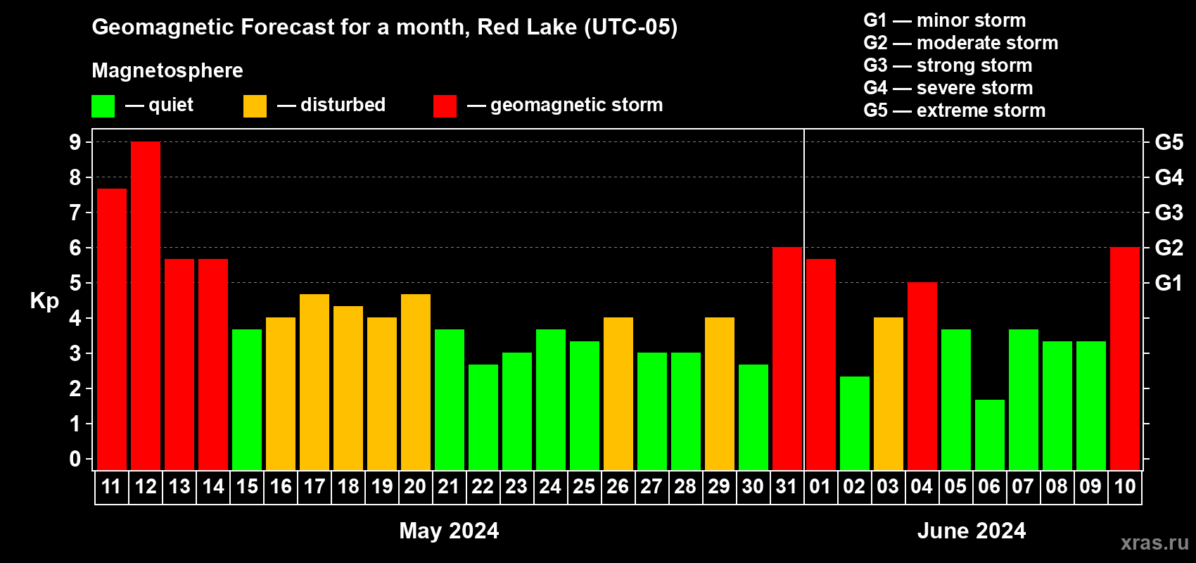 Geomagnetic storm forecast in Red Lake for May 11, 2024