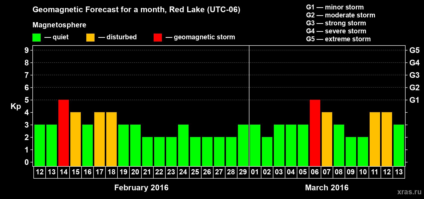 Geomagnetic storm forecast in Red Lake for Feb 12, 2016