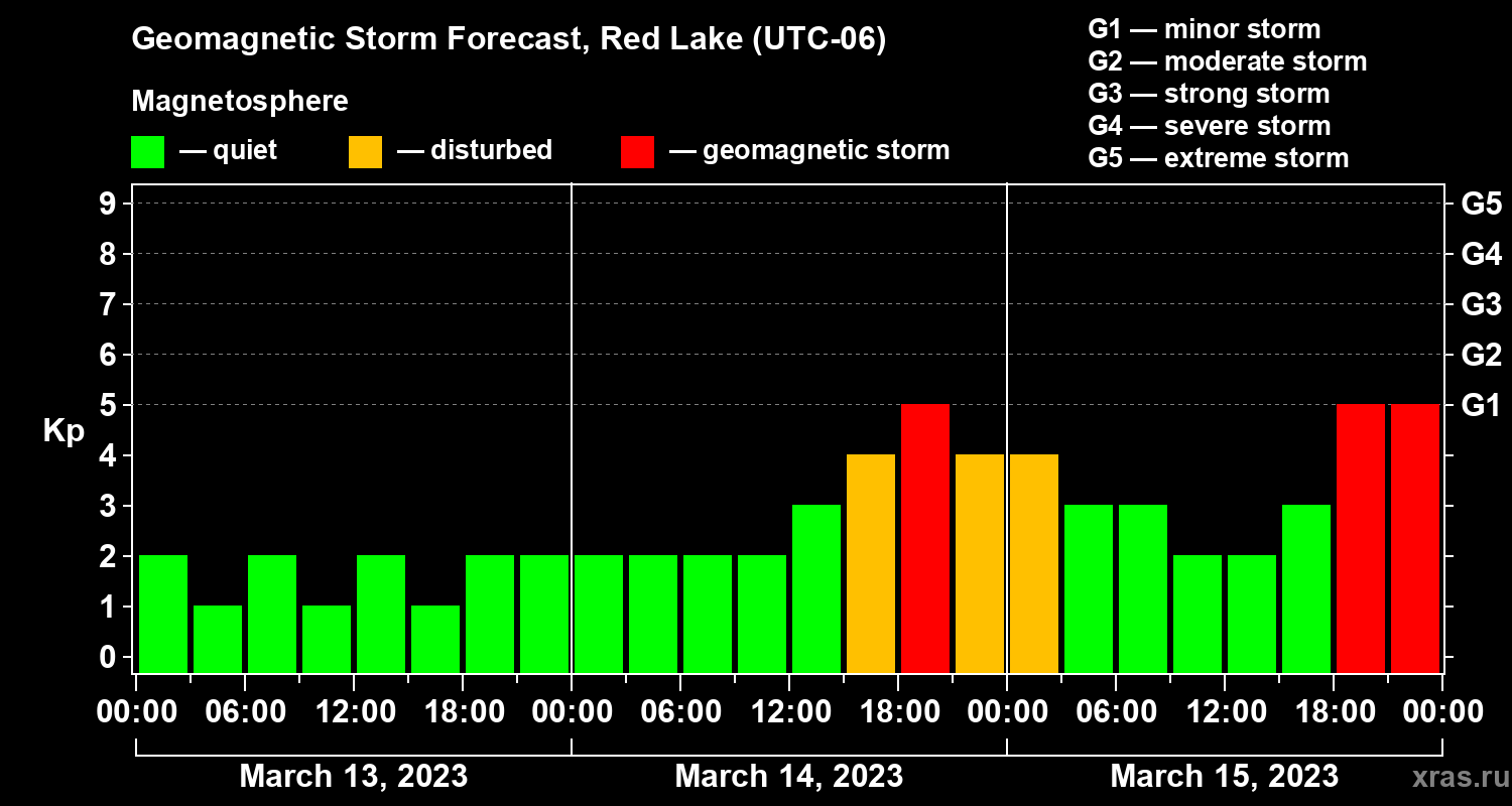 Geomagnetic storm forecast in Red Lake for Mar 13, 2023