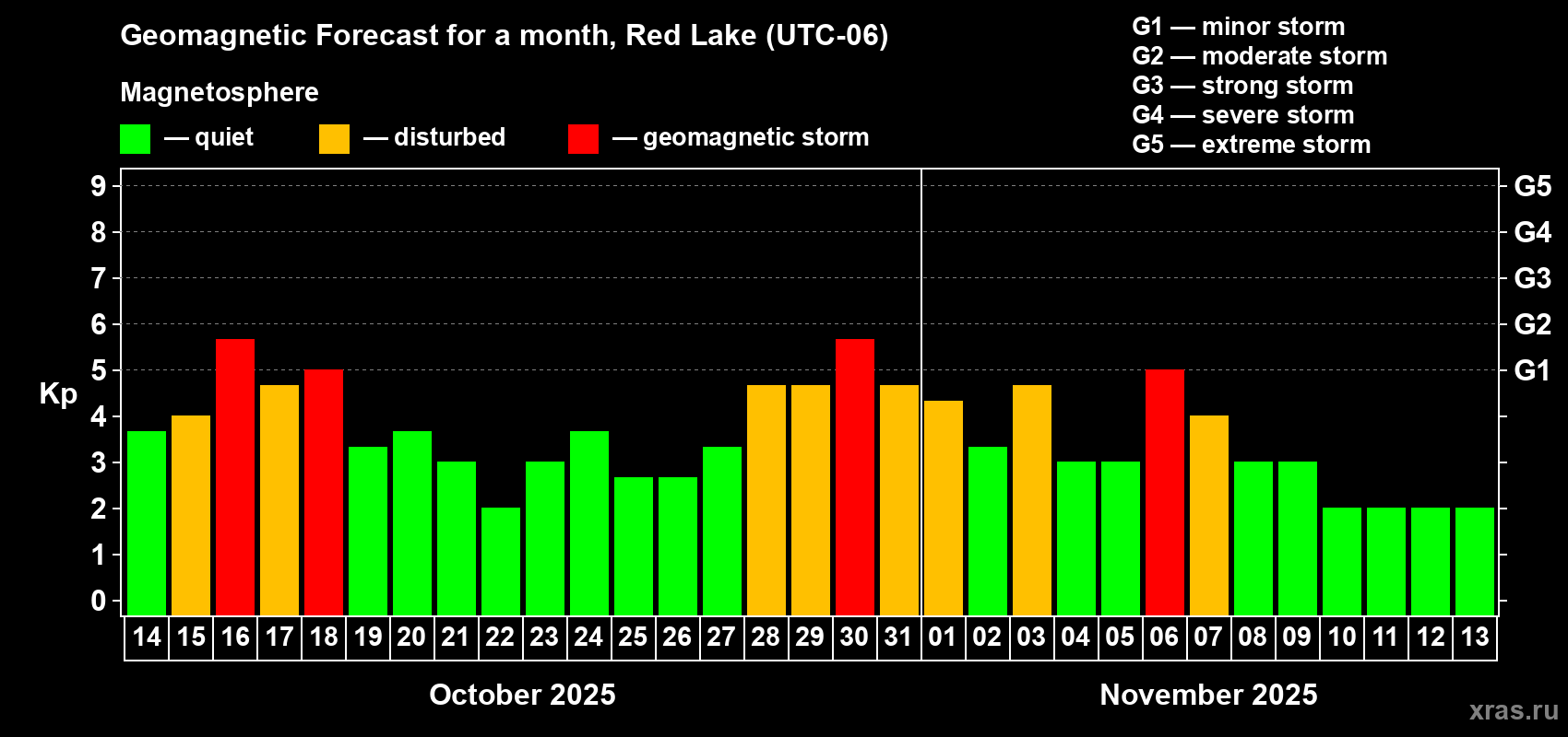 Geomagnetic storm forecast in Red Lake for Oct 14, 2025