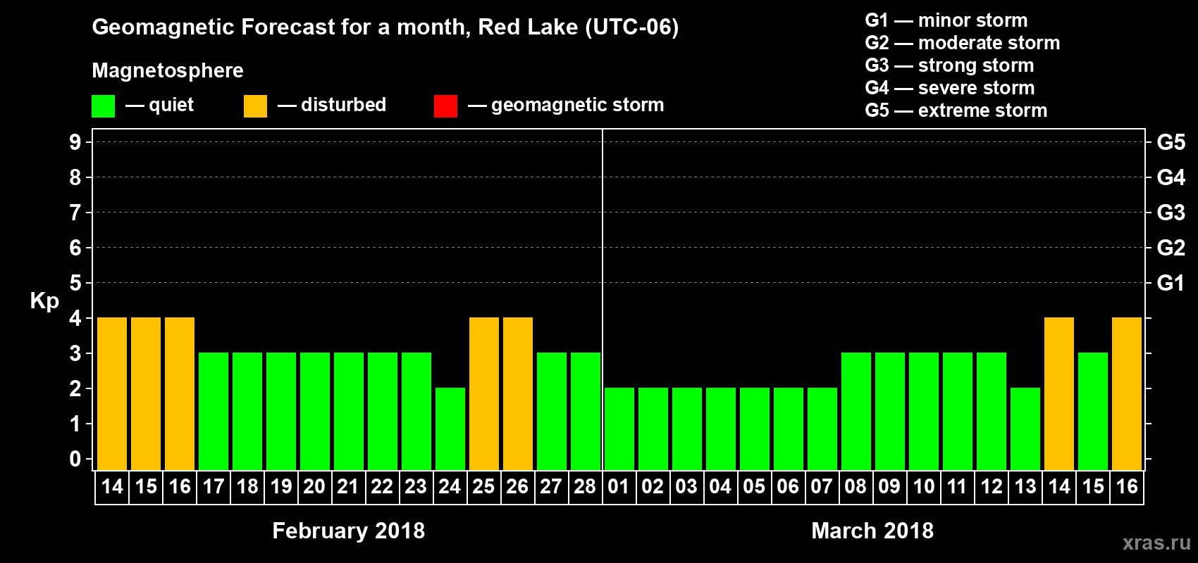 Geomagnetic storm forecast in Red Lake for Feb 14, 2018