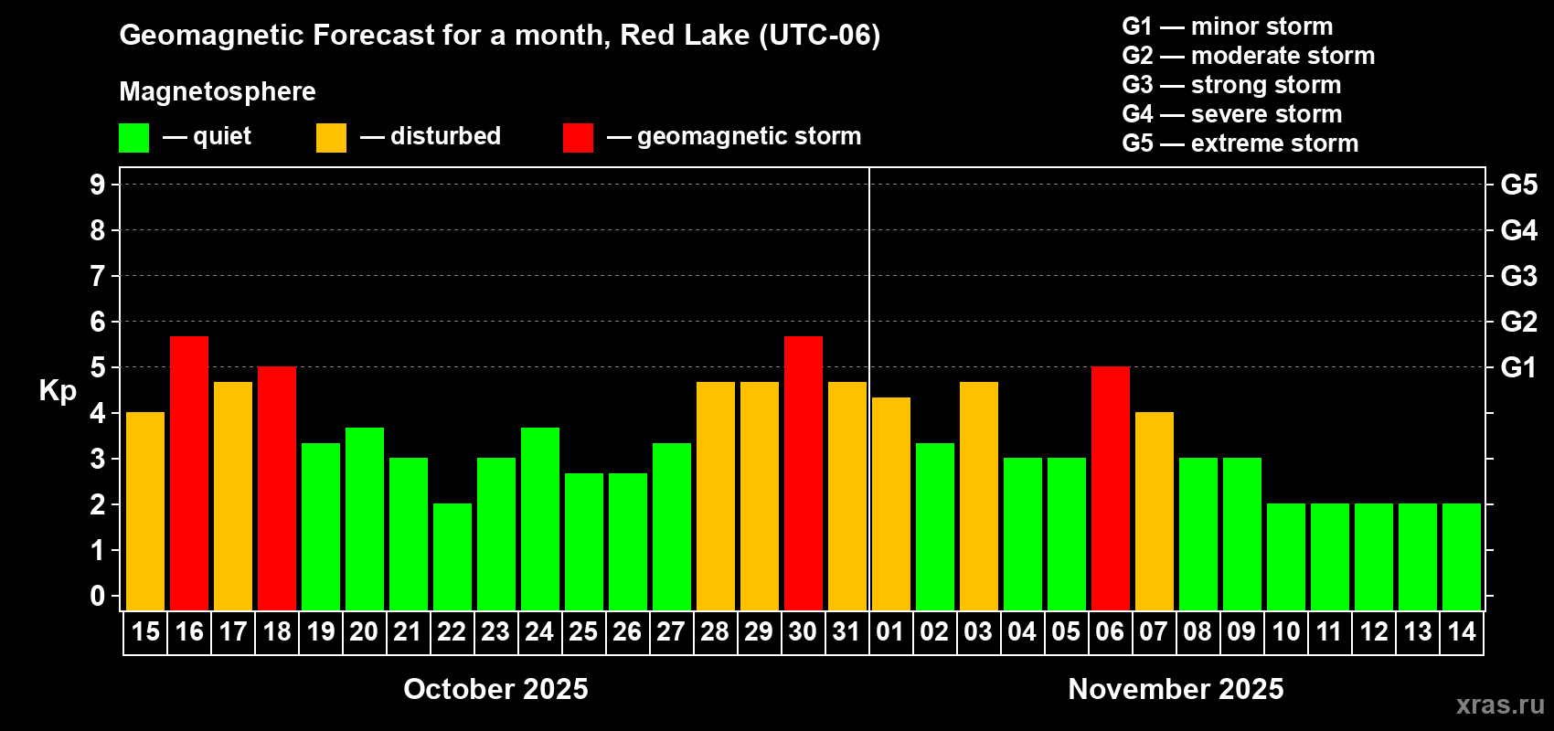 Geomagnetic storm forecast in Red Lake for Oct 15, 2025