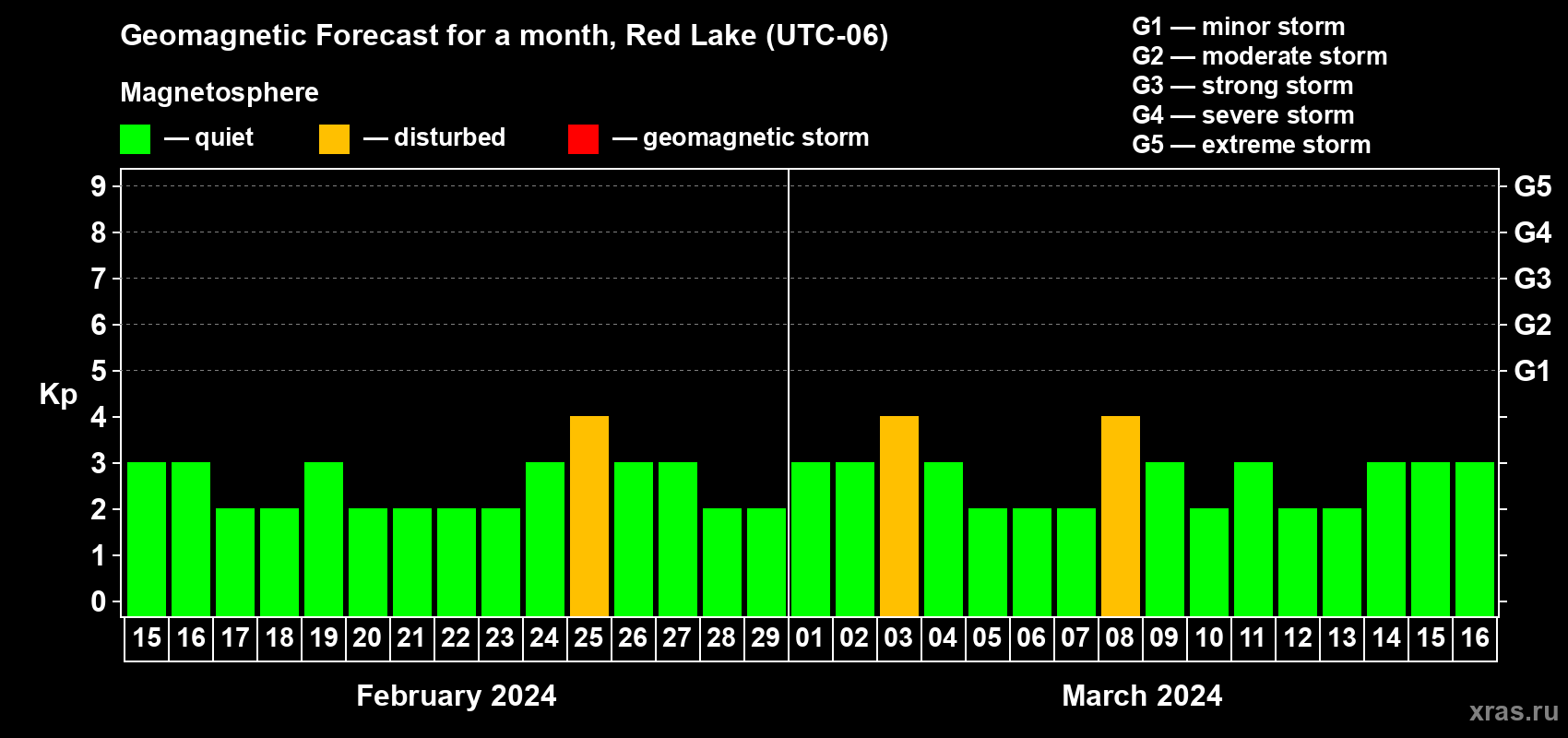 Geomagnetic storm forecast in Red Lake for Feb 15, 2024