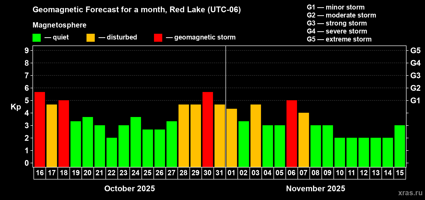 Geomagnetic storm forecast in Red Lake for Oct 16, 2025