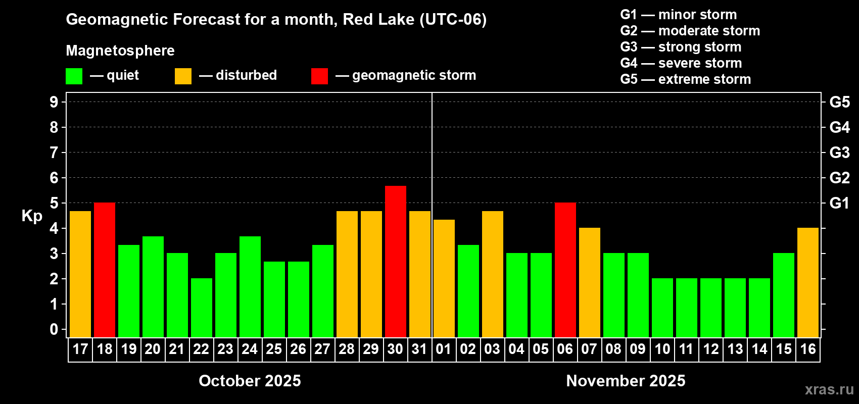 Geomagnetic storm forecast in Red Lake for Oct 17, 2025