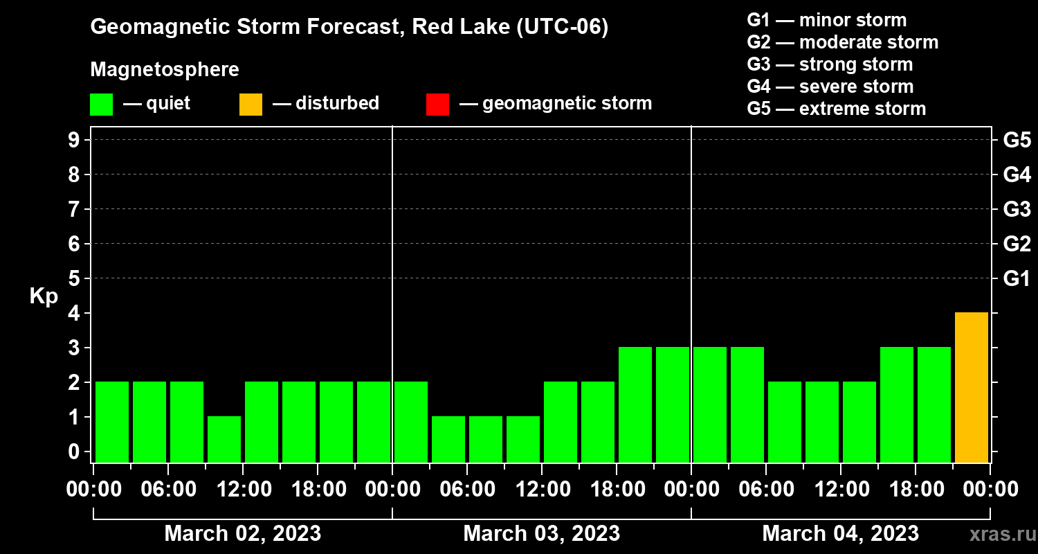 Geomagnetic storm forecast in Red Lake for Mar 02, 2023